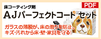ツルツル滑る床は人にも愛犬にとっても危険です。それはまるでスケートリンクに立っているようなもの。足腰に負担がかかり、滑って転んだことがきっかけで、ヘルニアや股関節の脱臼などといった大きな疾患につながる事もあります。AJパーフェクトコートはナノコンポジット技術による「ガラスの薄膜」で、床・壁・家具などの表面をコーティングし、キズ・汚れから床・壁・家具を守ります。フローリング、クッションフロア、タイル、コンクリート等、今の床に塗るだけで滑りにくくなり、お子様や高齢者、愛犬の足腰の負担を軽減し、家族みんなの安全性を高めます。